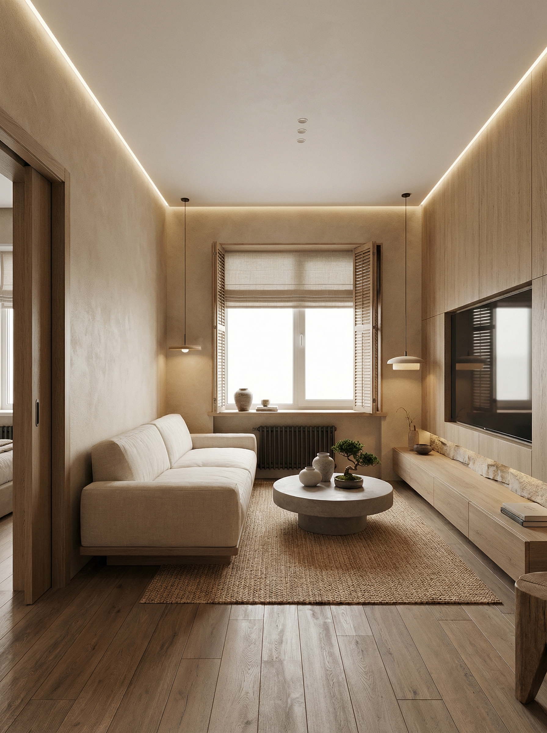 Гармоничное сочетание японской эстетики и скандинавской функциональности. Натуральное дерево, нейтральные тона и осознанный подход к каждому элементу интерьера.