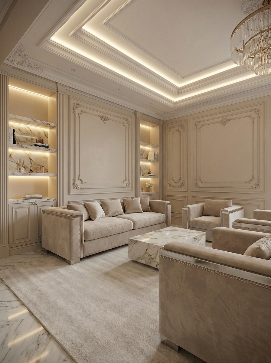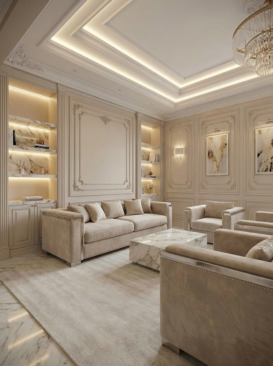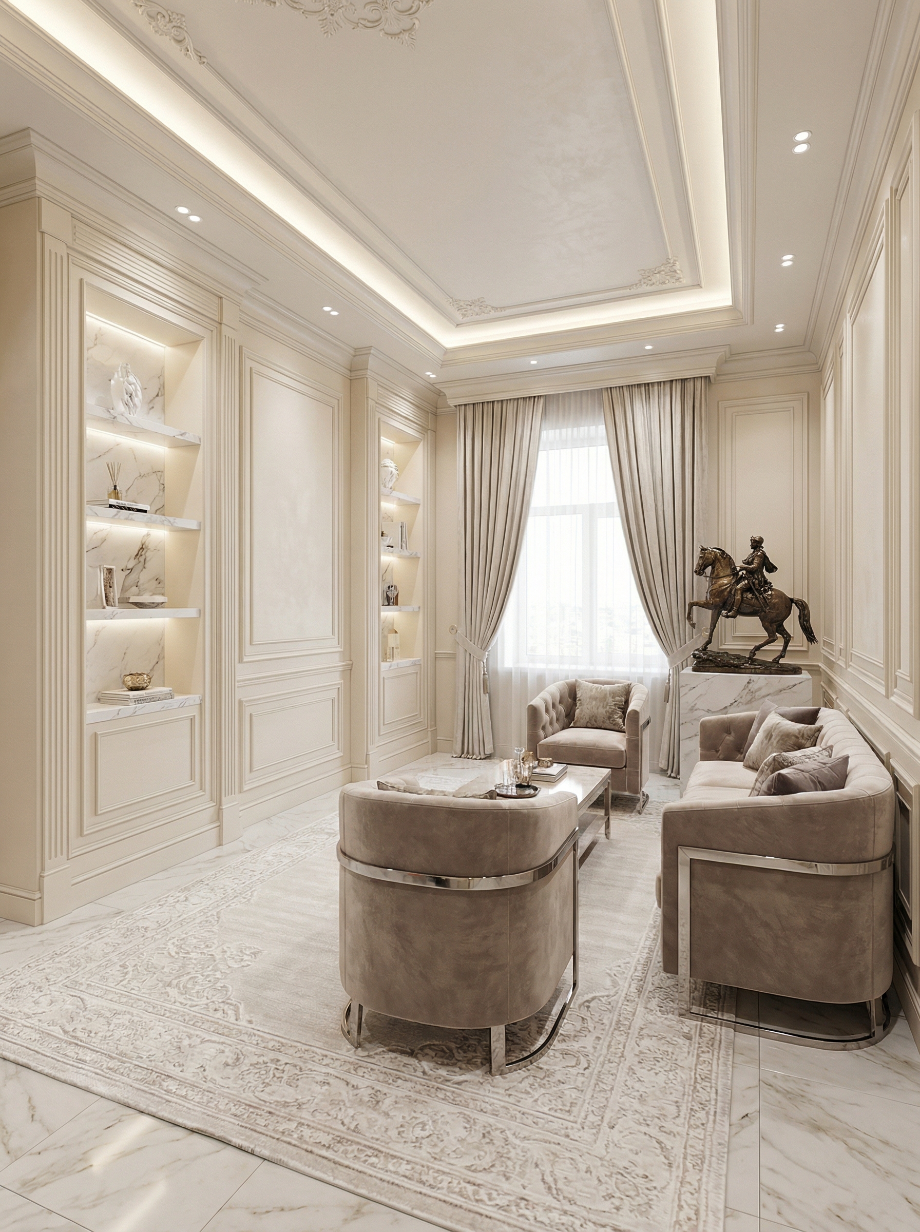 Утончённый стиль с симметрией, лепниной и благородными материалами. Классический интерьер сочетает роскошь и сдержанность, создавая атмосферу вневременной элегантности.