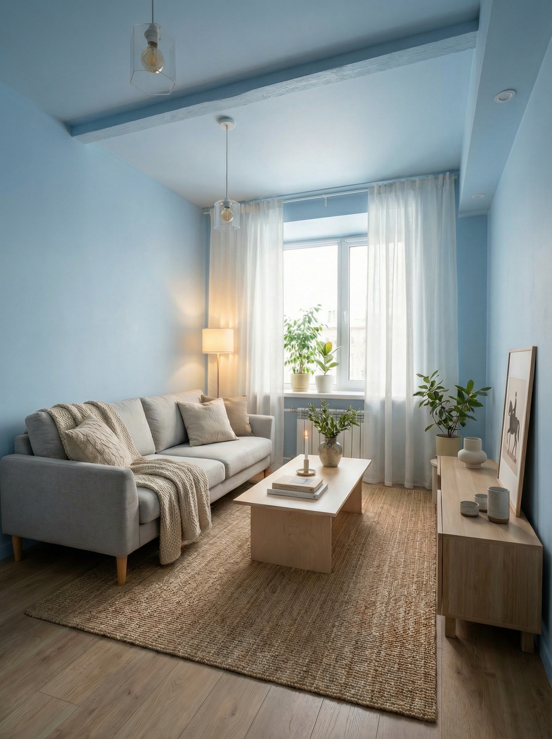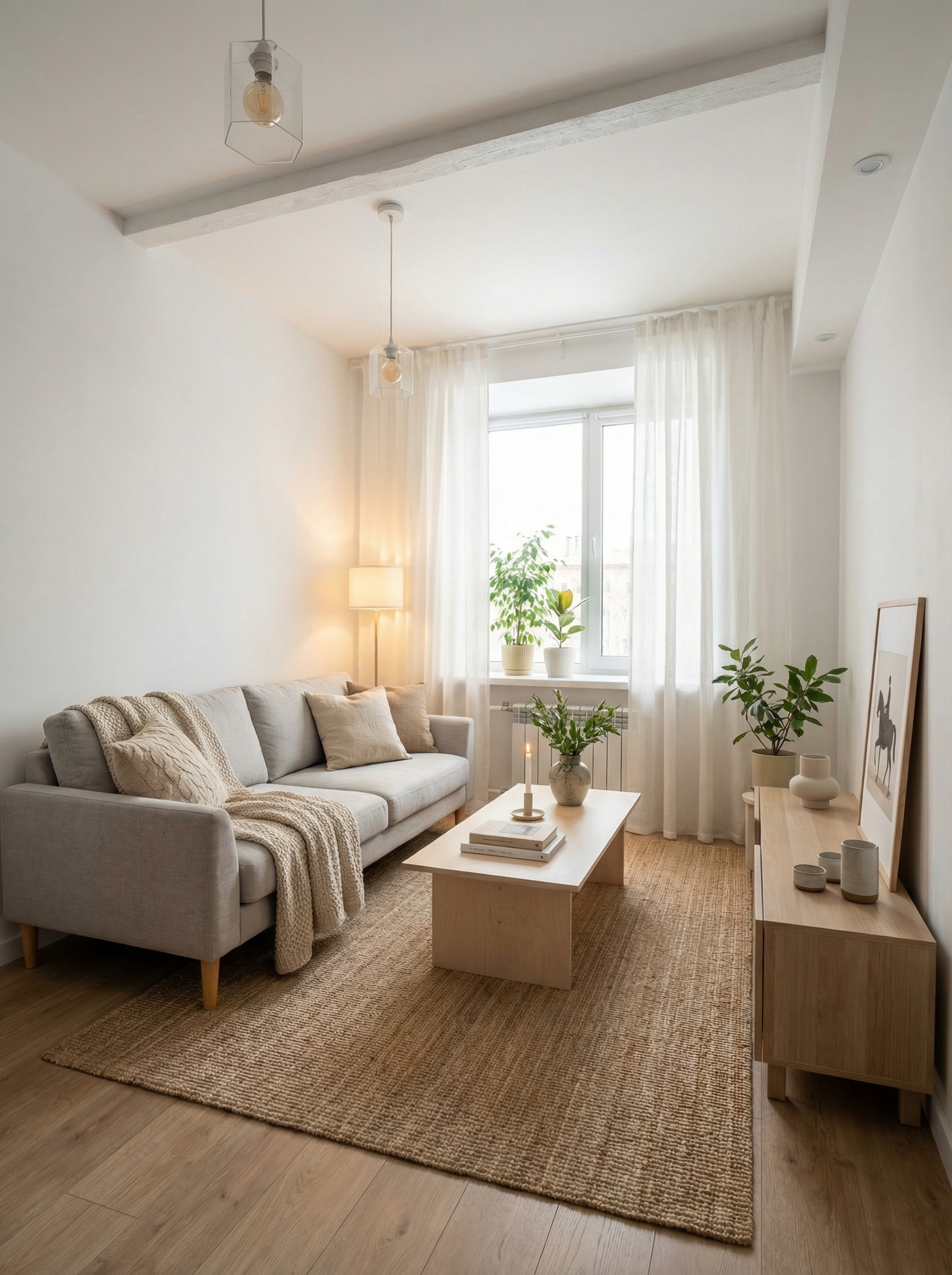 Уютный скандинавский стиль с акцентом на комфорт и тёплую атмосферу. Натуральные материалы, мягкие текстуры и приглушённые тона создают ощущение домашнего тепла и спокойствия.